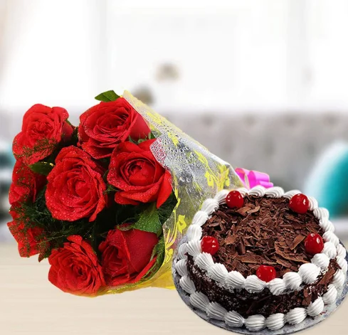 Who doesn’t cherish the perfect taste of a black forest cake? The essentially compelling velvety cake is joined with an excellent bunch of red roses to offer your darling most extreme delight. Along these lines, on any significant event show your sentimental side with this entrancing red roses and cake combo. Eight excellent red roses are orchestrated in a rich shape with a yummy black forest cake to communicate your affection for your friends and family.