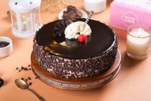 Contains : Black Forest cake | Are you one of them who celebrates every moment of happiness with a nice cake? If yes; this chocolate-cream made round shaped Black Forest cake is just for you. Enticingly decorated with chocolate flakes; maraschino cherries and luscious chocolate shavings; this cake simply a heaven out of the box.